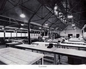 THE LAUNDRY is so planned and sited as to permit of Male staff delivering and collecting the washing without traversing the Female and Children’s areas of the site. The building is designed on modern principles to provide for dealing with approximately 10,000 articles per week and while modern machinery has been installed for all essential processes, a somewhat larger proportion of hand washing troughs and ironing boards has been provided than is usual in a commercial laundry, in order to give useful occupation to the patients.