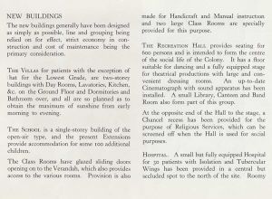 The Mansion when first opened accommodated 87 patients which was later increased to 103, but in 1928 a limited competition was held and the plans of the Architects, Messrs. J. M. Sheppard & Partners selected, for a Colony which provides for ultimate extension up to 900 patients, divided into three groups, namely, Male, Female and Children, each group being further sub-divided according to the various classification of the patients, but all so grouped around the central buildings – Recreation Hall, Kitchen, Stores, Laundry, &c. Which form the hub of the Scheme – as to facilitate easy access and economy of administration.